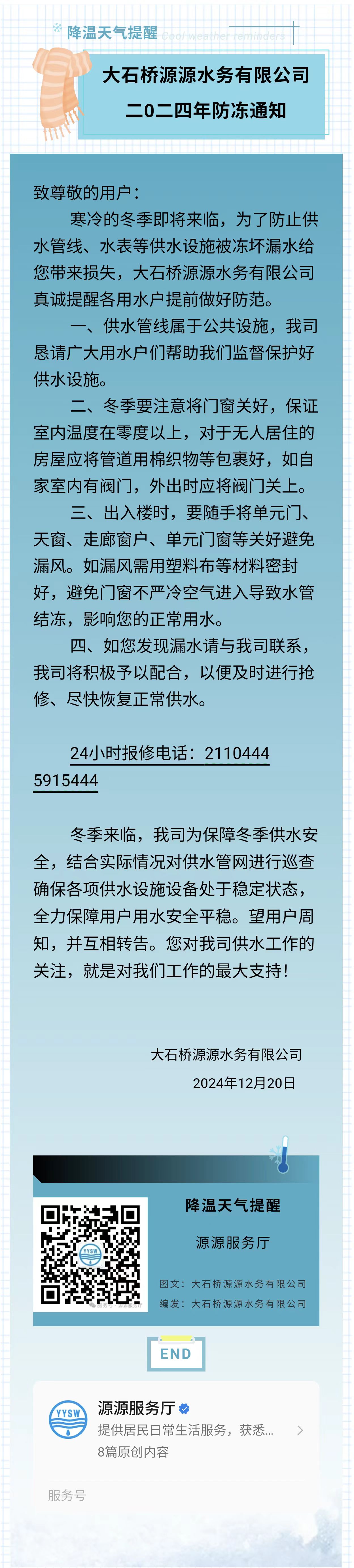 公司新聞 您當(dāng)前的位置: 大石橋源源水務(wù)有限公司 >資訊動(dòng)態(tài) >公司新聞 關(guān)于冬季防寒防凍的溫馨提示 作者: 2021-03-15 下一篇:無 下一篇:源源水務(wù)九月份刷倉(cāng)通知 返回